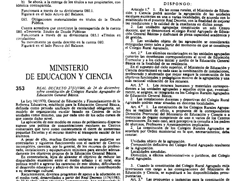 El Ministerio de Educación español redactó el Real Decreto nº 2731/1986, de 24 de diciembre, que incluía por primera vez la posibilidad de establecer colegios rurales colectivos de educación general básica para crear escuelas rurales más eficientes.